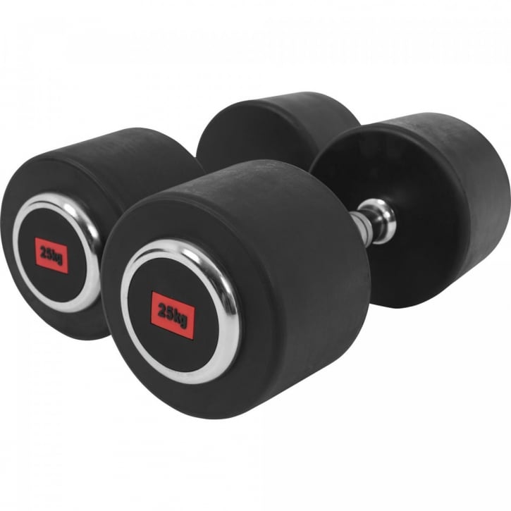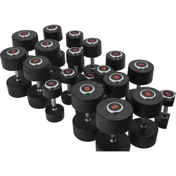 De fasta hantlarna finns i 20st olika vikter mellan 2,5-50kg och är gjorda av gjutjärn täckta av stryktåligt gummi som dämpar onödigt buller och skyddar såväl golv som hanteln.