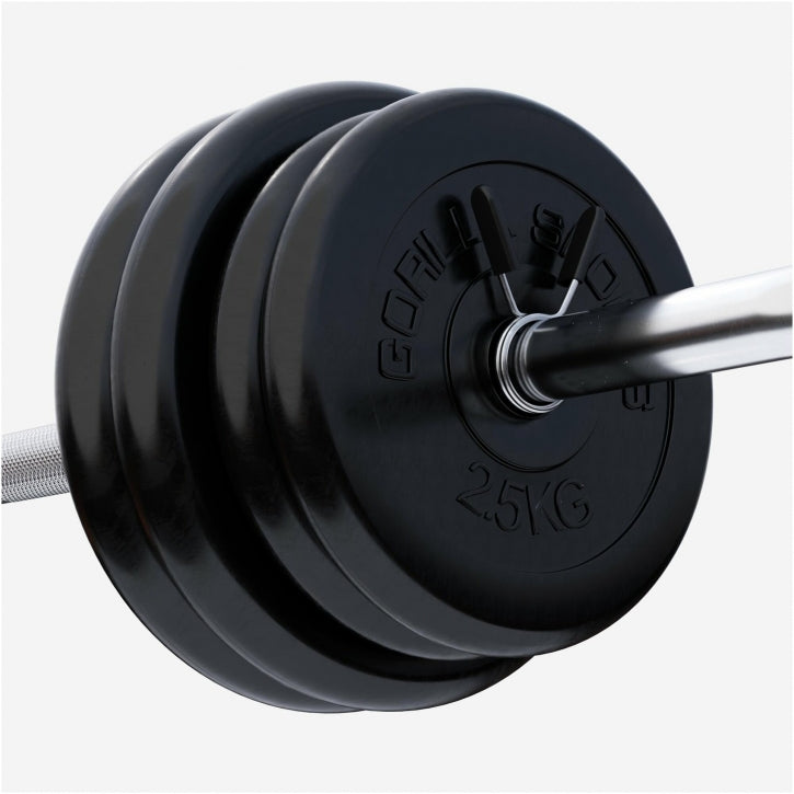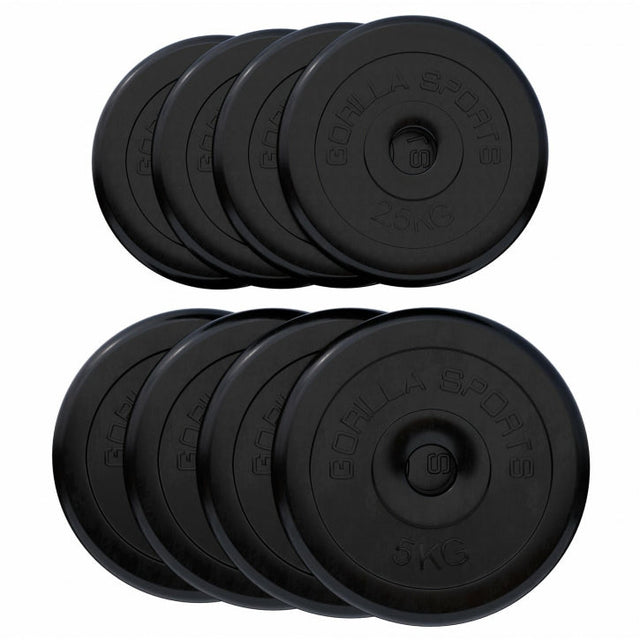 Viktskivorna som ingår är fyra 5kg-viktskivor och fyra 2,5kg-viktskivor totalt 30kg, och alla med 8mm tjock gummibeläggning som skyddar ditt golv från skador samt reducerar ljudbuller och skyddar dina vikter.