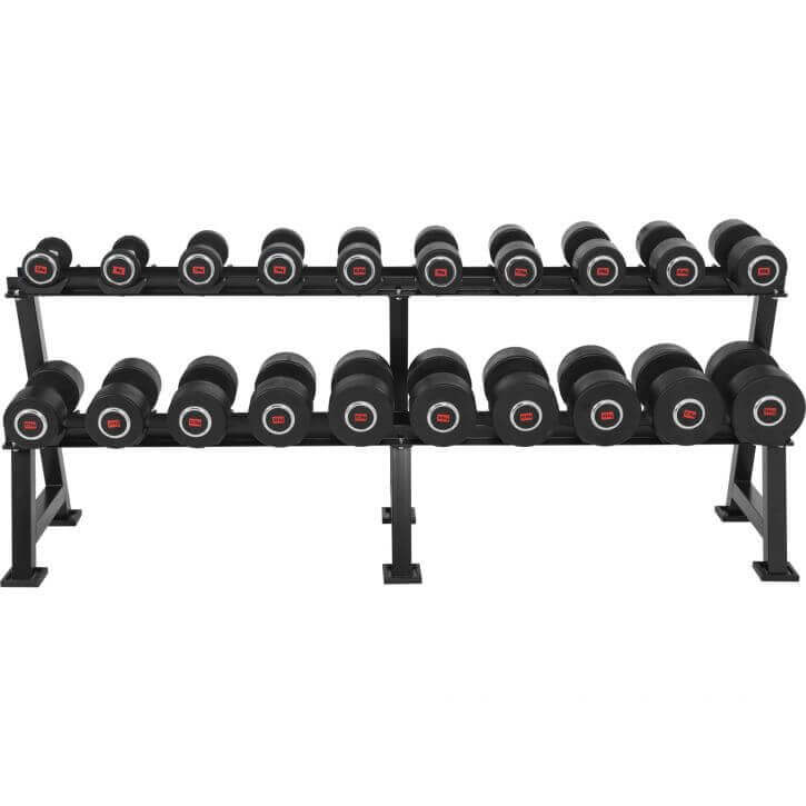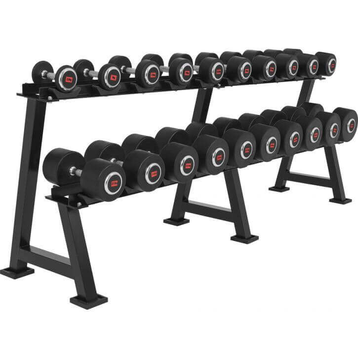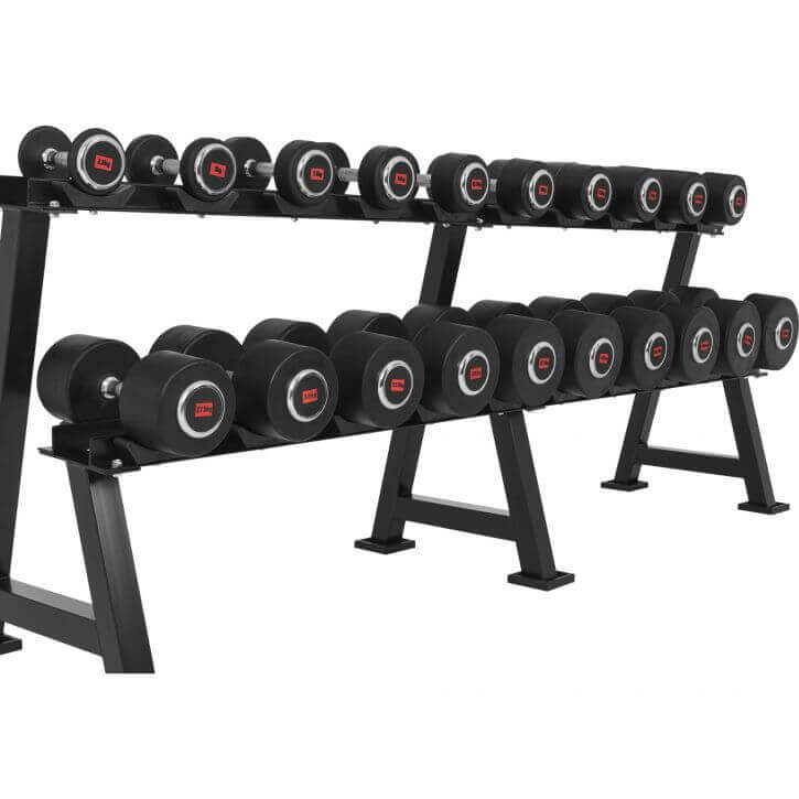 Med det här hantelstället i svart från Gorilla Sports säkerställer du ett snyggt hemmagym och det blir superenkelt att hålla ordning bland hantelpar och vilken vikt som ligger vart.
