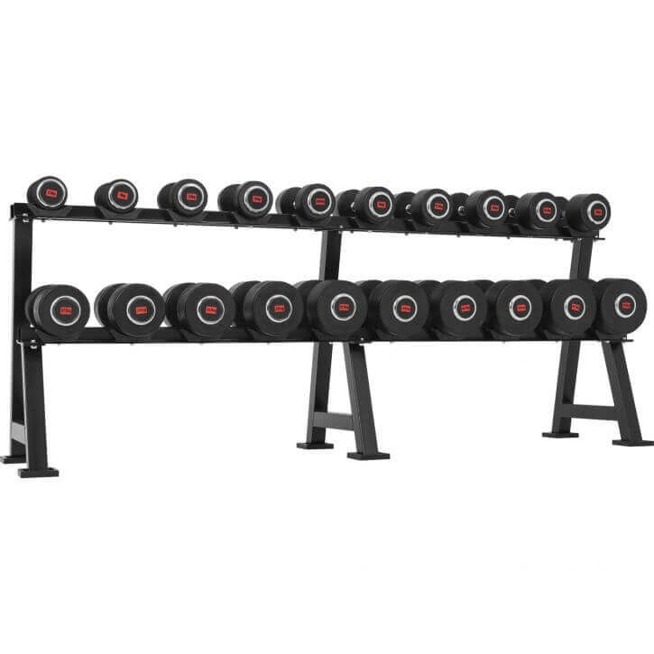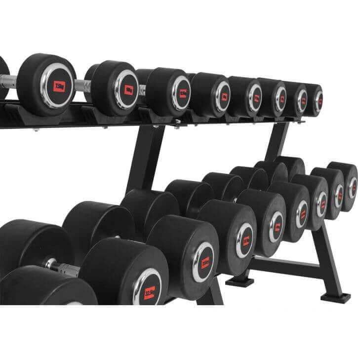 Hantelstället väger 71 kg, är robust och har förvaringsfack som passar hantlar med en handtagslängd på 15cm.