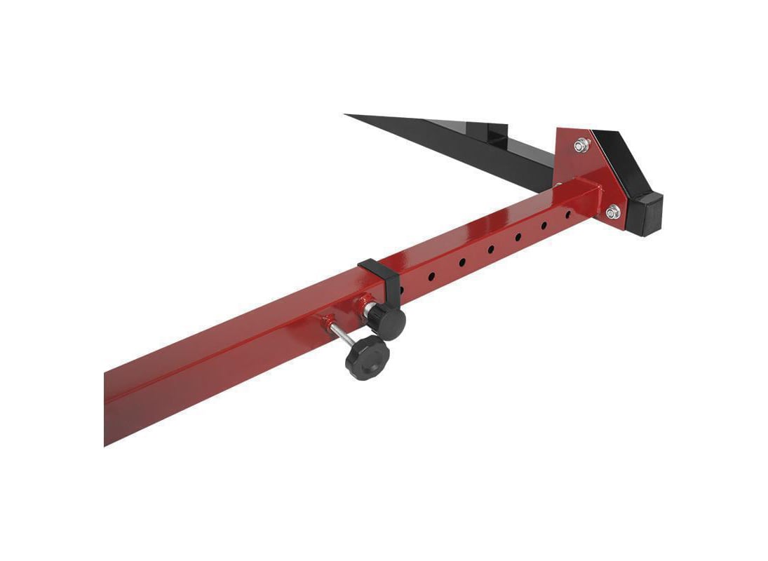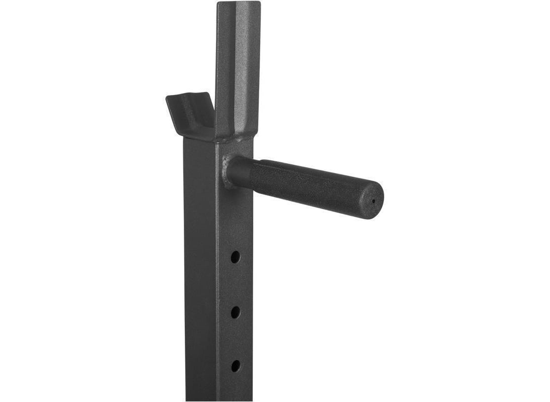 Det är en ordentlig konstruktion med extra säkerhetsplan för maximal trygghet och den är perfekt att kombinera med en bänk för att kunna utföra ytterligare övningar tex träna bänkpress.