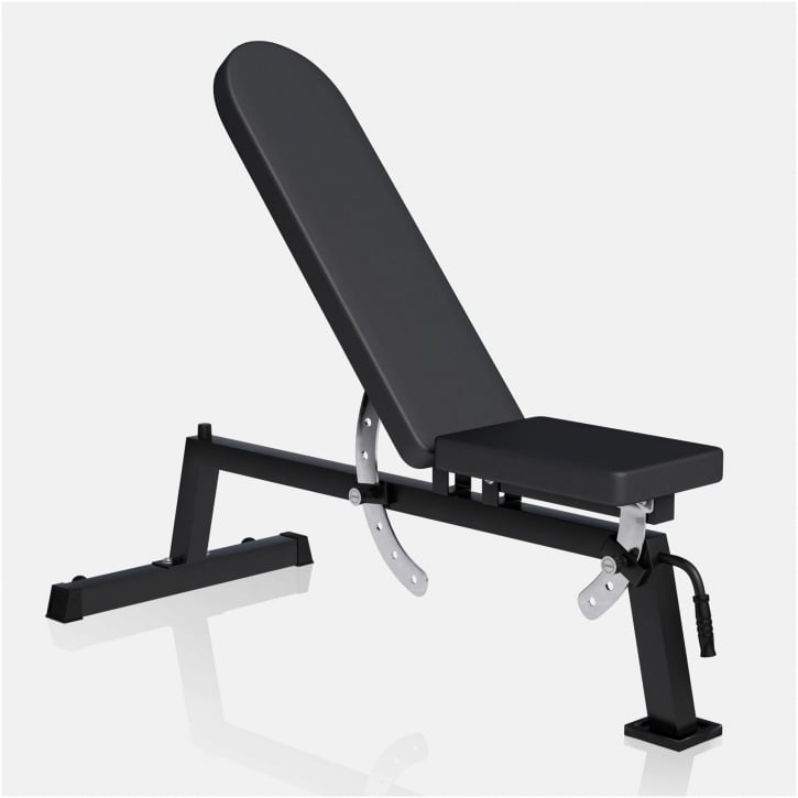 Ställbar träningsbänk som klarar av en belastning på 4288kg, väger 30kg och har hjul och handtag så du enkelt kan flytta runt den i gymmet.
