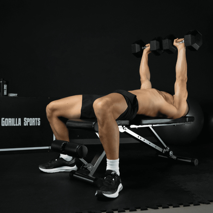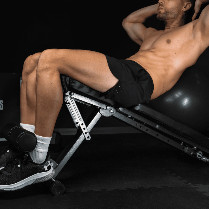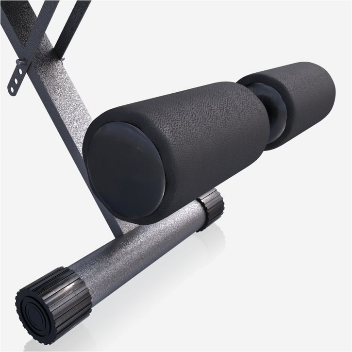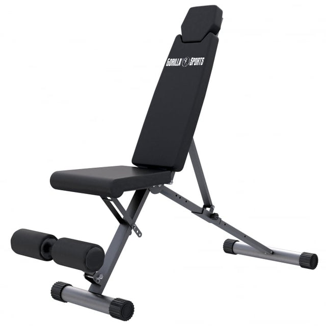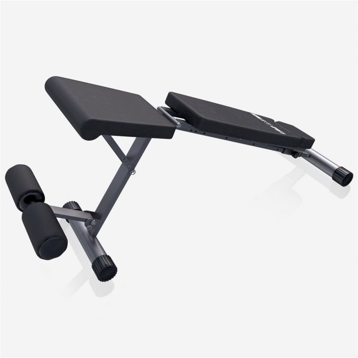 Hopfällbar träningsbänk med en maximal lastkapacitet på 200kg, en sitthöjd på 44,5cm och justerbart ryggstöd från ca 90 grader till negativ lutning.