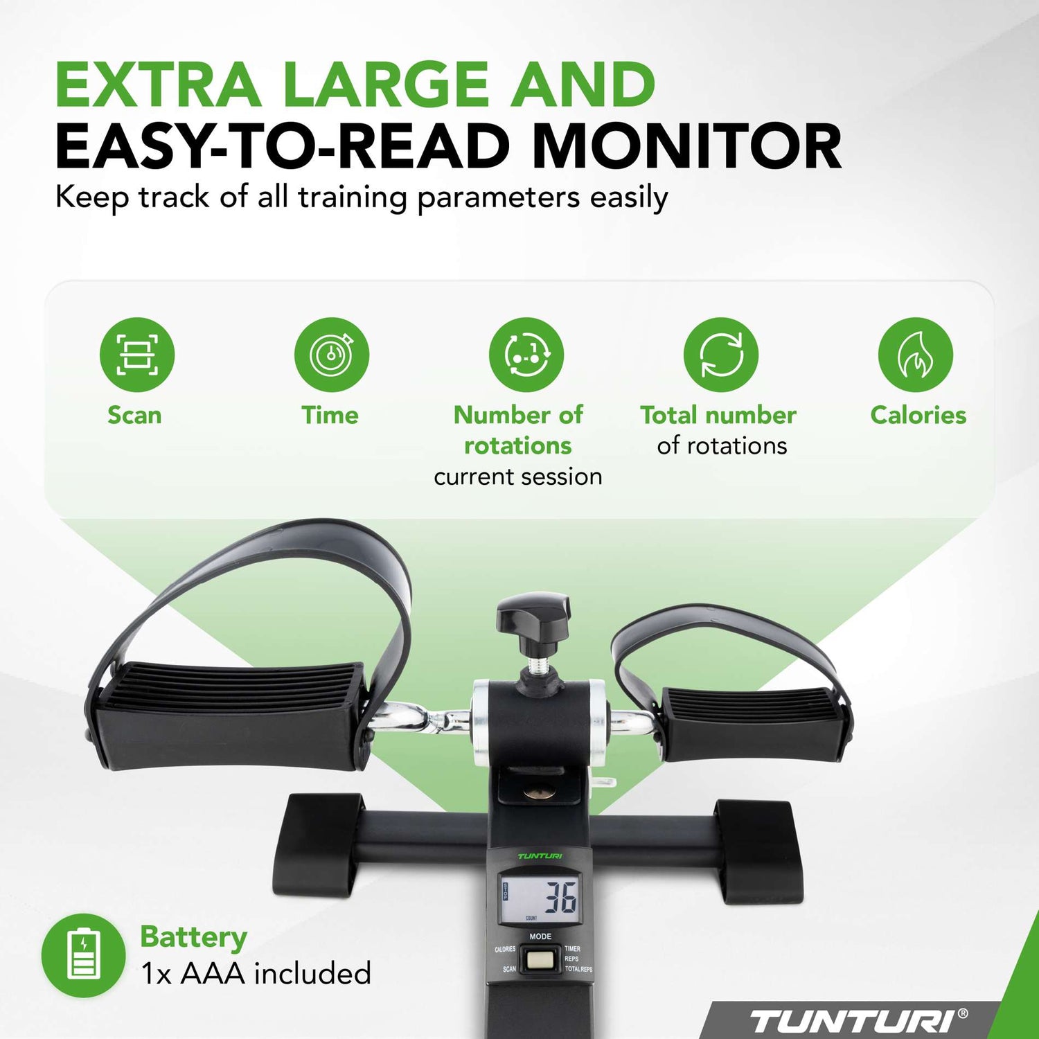 Tunturi Mini Bike Pro är en kompakt, mångsidig och stabil minicykel för den perfekta träningen. Tack vare sina breda, stadiga ben är enheten alltid stabil, lämplig för träning av både armar och ben. Minicykeln har en liten display som visar ungefärliga förbrända kalorier, tid och antal rotationer.