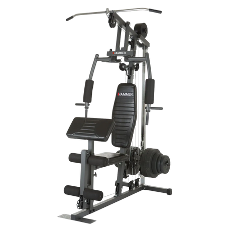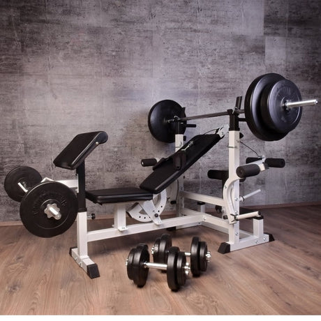 Ett multigym är den perfekta lösningen för dig som vill ha ett komplett hemmagym i en och samma maskin. Våra multigym ger dig möjlighet att träna hela kroppen med en stabil och säker konstruktion. Med flera stationer kan du träna bröst, rygg, ben, armar, axlar och mage utan att behöva köpa flera olika maskiner. Multigymen finns i två färger, vitt och svart, och kommer i olika paket där viktskivor och tillbehör varierar.