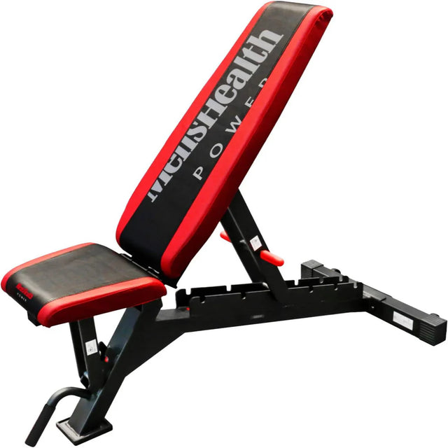 Den här ställbara träningsbänken från Lukadora är väldigt funktionell men även riktigt snygg! Den har en unik svart och röd färg och Men's Health logga på ryggstöden. Men's Health är en av världens största träningstidningar.