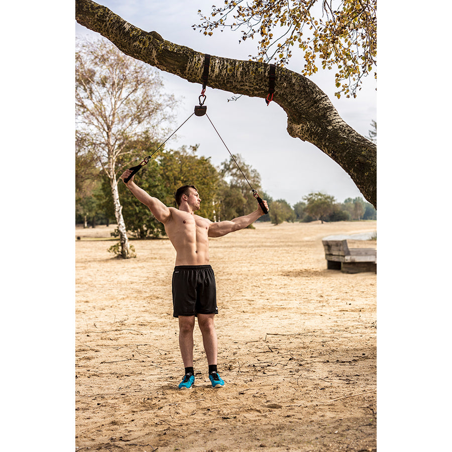 Träna på stranden, i skogen eller inomhus – allt är möjligt med detta Tunturi Cross Fit Trainer-set. Paketet innehåller flera olika träningsredskap för övningar som anpassas efter din egen kroppsvikt. Crossfitutrustningen kan fästas på till exempel en dörr, ett träd eller en stång. De långa huvudsträngarna med D-ringar utgör grunden och kan kompletteras med ringar, handtag eller fotöglor. Du kan enkelt justera längden genom att fästa tillbehören på en annan D-ring. Den medföljande remskivan möjliggör rörliga upphängningsövningar.