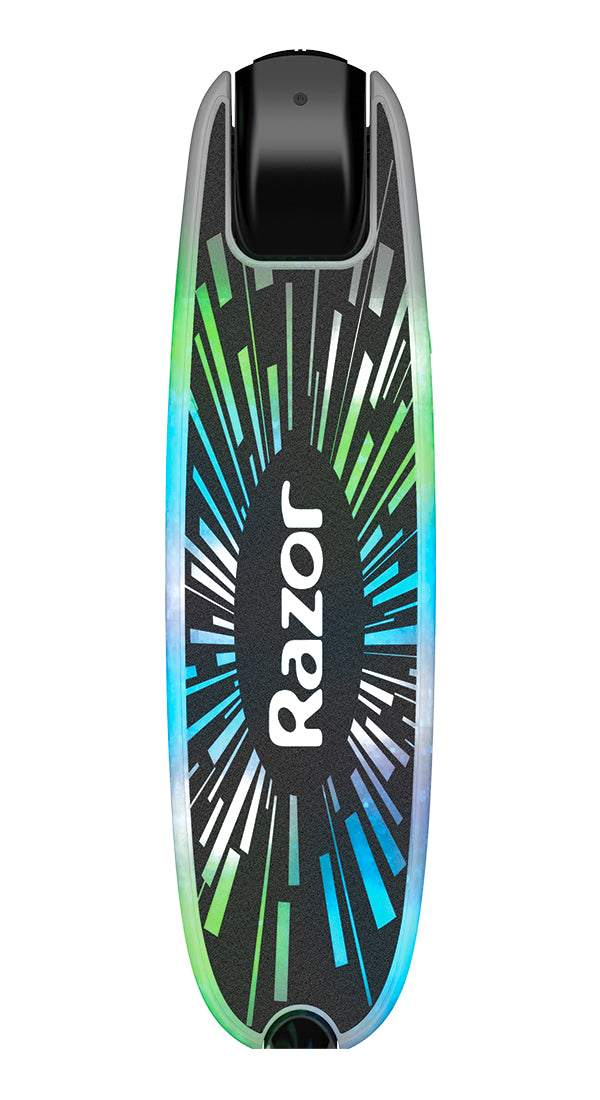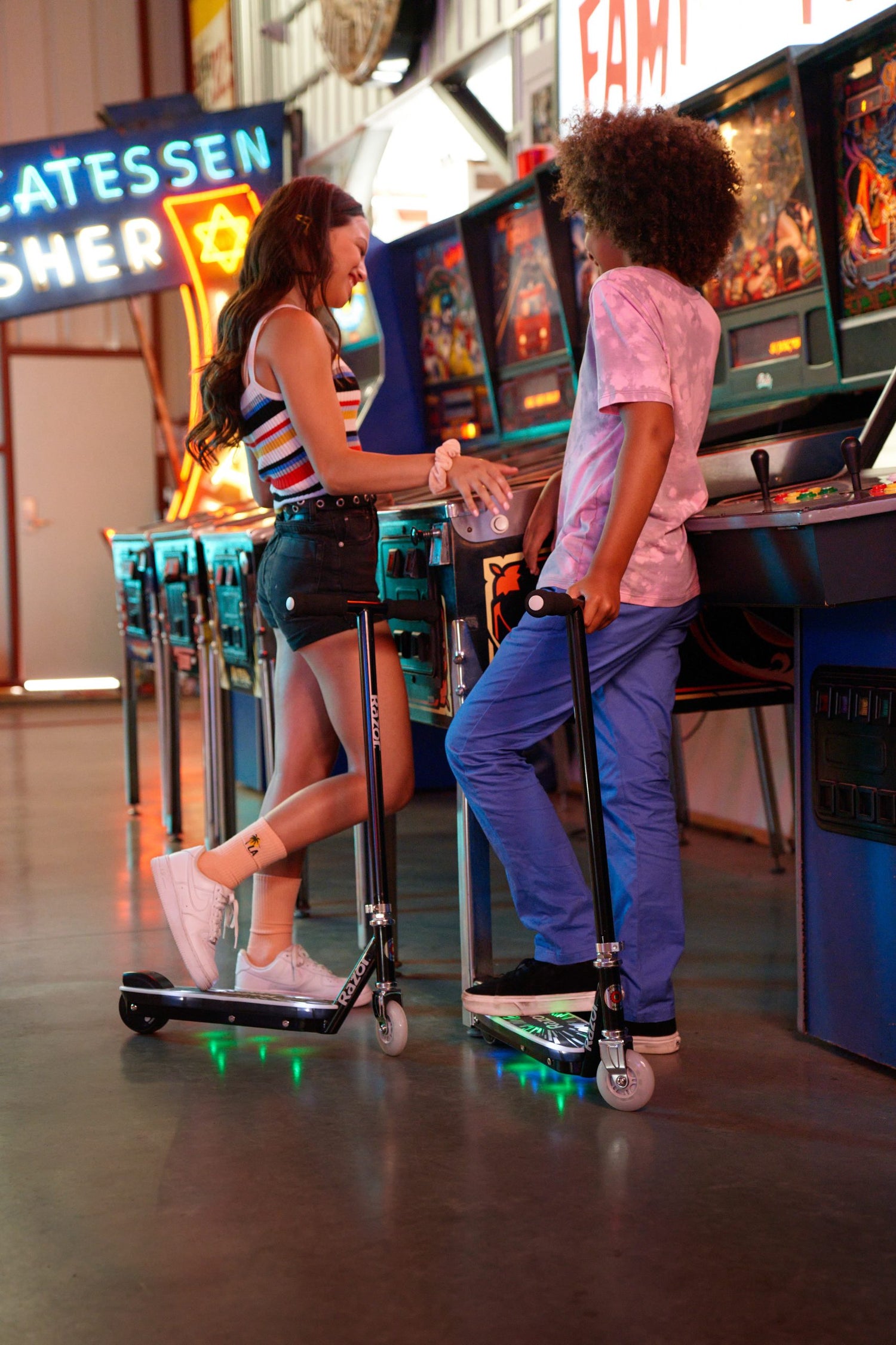 Razor elektriska Tekno scooter tar sig alltid till barnens disco. Flerfärgade LED-lampor finns ovanpå och under ståplattan samt inuti framhjulet. Motorn sitter på bakhjulet, för att starta sparkcykeln, tryck på spaken. För att öka hastigheten, tryck på plattformen och för att stoppa, tryck på baknavet. Accelerationen är mjuk och inte för plötslig, lämplig för barn. Hastigheten är upp till 12 km/h och turen varar i 30 minuter.