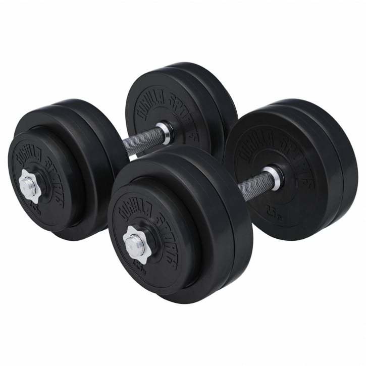 Med det här paketet hantlar får du en vikt på totalt 30kg(2x15kg) att träna med i form av två hantelstänger och åtta viktskivor i två olika vikter.
