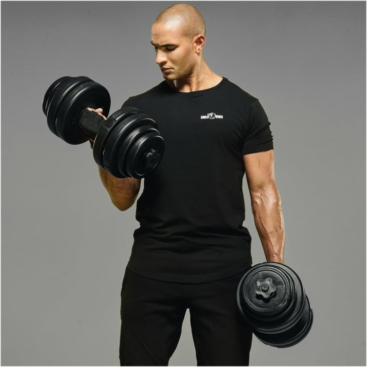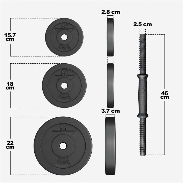 Totalt innehåller paketet 16st viktskivor i tre olika vikter mellan 0,75-2,5kg som totalt blir 28kg. Hantelstängerna väger 1kg vardera och har utrymme nog för att ge en hantel en maxvikt på 20kg.