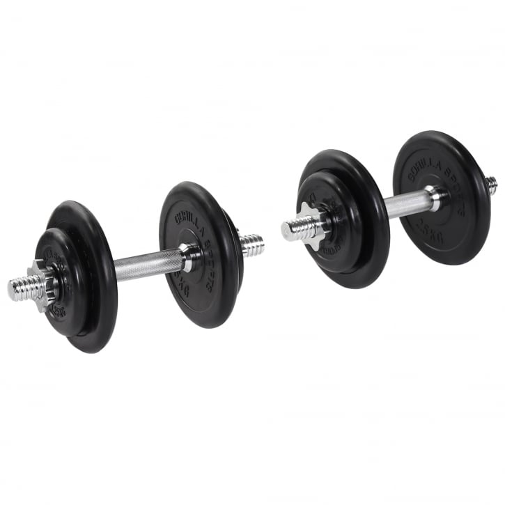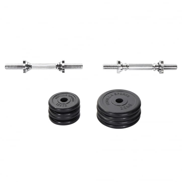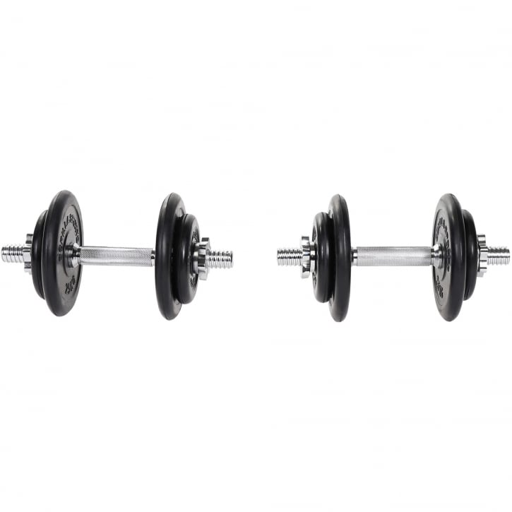 Hantelset med en vikt på totalt 20kg beståendes av, två hantelstänger med fyra stjärnlås, fyra viktskivor som väger 1,25kg och fyra viktskivor som väger 2,5kg. Dessa gummerade gjutjärns-viktskivor är tillverkade i högsta kvalitet med gummibeläggning.