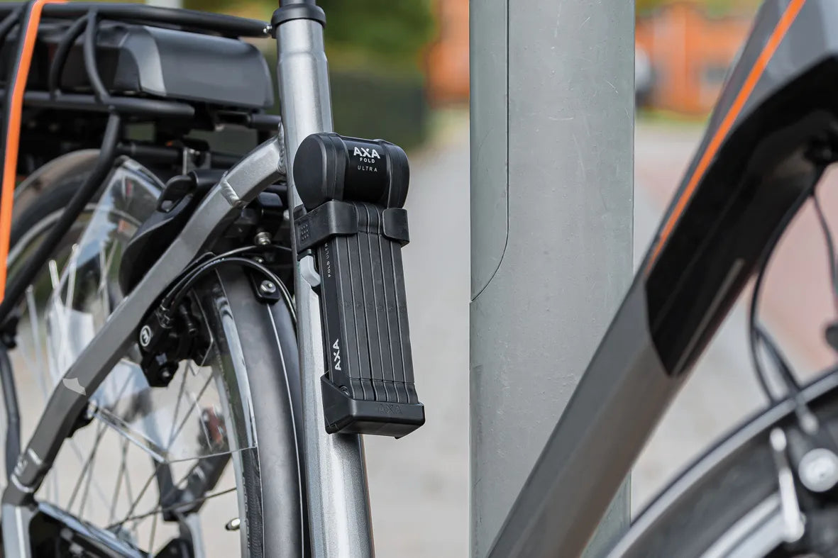 Axa Fold Ultra 90 är ett högkvalitativt hänglås designat för långtidsparkering i högriskområden. Fold Ultra 90 är Sold Secure Gold, SBSC, Varefakta och ART 2-stjärnigt certifierat. Det levereras med ett brytarlås som öppnas med en knapptryckning och kan fästas på flaskhållaren eller, i avsaknad av dessa, på en annan del av cykelramen med speciella fästen. Två nycklar ingår också - om du tappar bort dem kan du beställa nya via Axa:s onlinesystem, förutsatt att du har skrivit ner nyckelnumret i förväg.