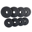 Det ingår totalt åtta viktskivor i två olika vikter; 4x2,5kg och 4x5kg, samtliga tillverkade av cement med skyddande plastbeläggning.