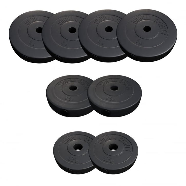 Paket med totalt åtta viktskivor på sammanlagt 27,5kg som passar stänger med en diameter på 30mm.