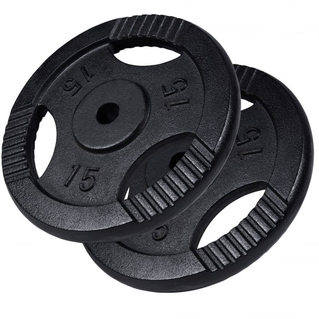 Paket med två viktskivor på 15kg vardera, båda med håldiameter på 31mm. Med just håldiameter på 31mm passar viktskivorna skivstänger med diameter på 30mm.