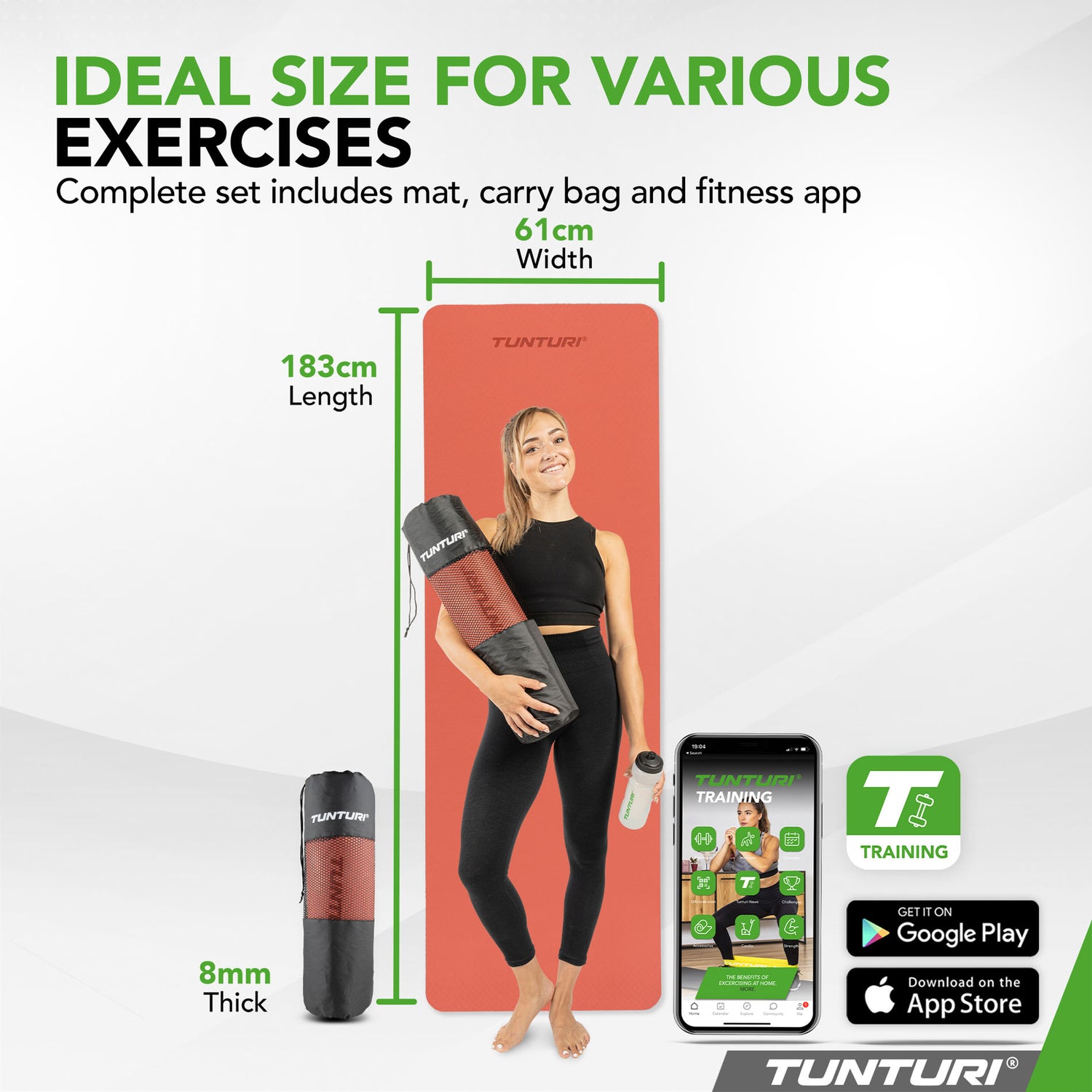 Vem tränar utan matta idag? Oavsett om du ligger ner för magövningar eller utövar yoga sittande, ger en matta extra komfort och stabilitet. Med Tunturis extra tjocka 8 mm matta har du en yogamatta, träningsmatta och motionsmatta i ett. Mattan ger extra komfort, belastar muskler och leder mindre och är tillverkad av miljövänligt material.